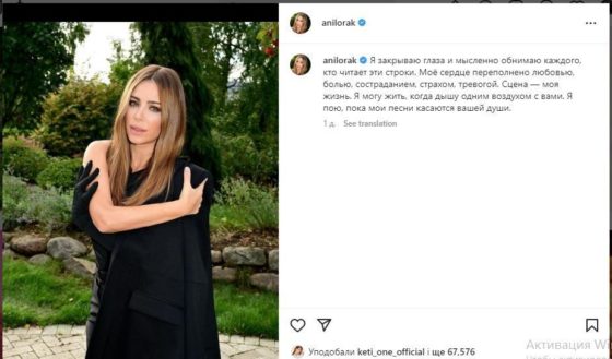 “Я заплющую очі і подумки обіймаю кожного, хто читає ці рядки. Моє серце сповнене любов’ю, болем, співчуттям, страхом, тривогою. Сцена – моє життя. Я можу жити, коли дихаю одним повітрям із вами. Я співаю, поки мої пісні торкаються вашої душі”, – написала “голубь міра”, для якої важливіші гроші, ніж життя її співвітчизників.