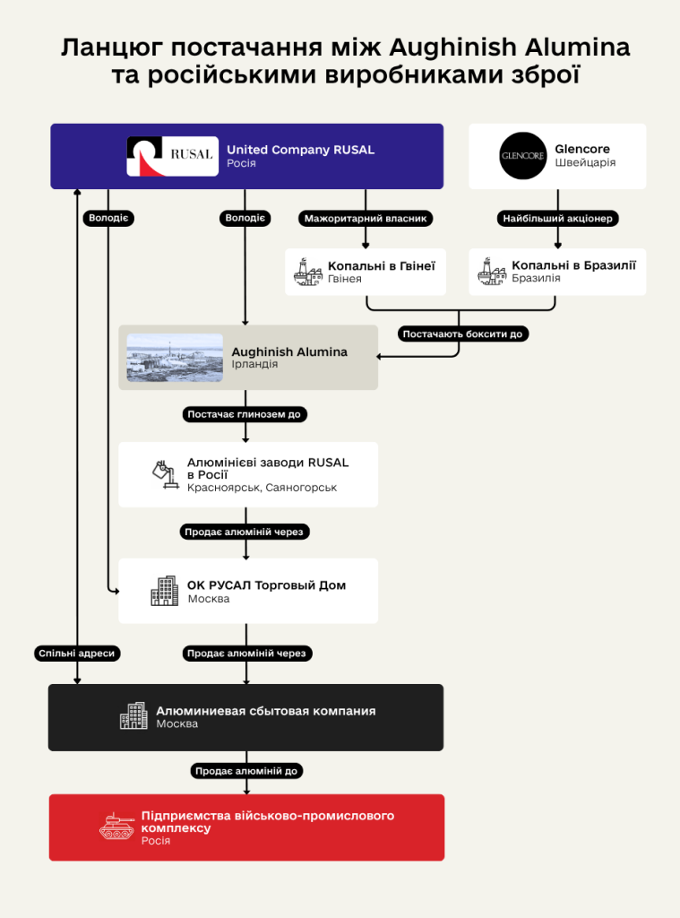 До 1995 року єдиним власником ірландського заводу був алюмінієвий гігант Alcan, який за кілька років продав Aughinish Alumina швейцарській компанії Glencore. Та вже 2007 року підприємство перейшло під контроль RUSAL — внаслідок масштабного злиття, що обʼєднало швейцарців з алюмінієвими активами Дерипаски та структурами підсанкційного російсько-ізраїльського мільярдера Віктора Вексельберга. Glencore нині — найбільший акціонер тієї самої амазонської копальні в Бразилії, а також має частку 10% у материнській компанії RUSAL — EN+ Group. Остання фактично уособлює бізнес-імперію Дерипаски, обʼєднуючи виробництво алюмінію з його енергетичними активами: сибірськими ГЕС, які постачають дешеву електроенергію безпосередньо на плавильні заводи корпорації.