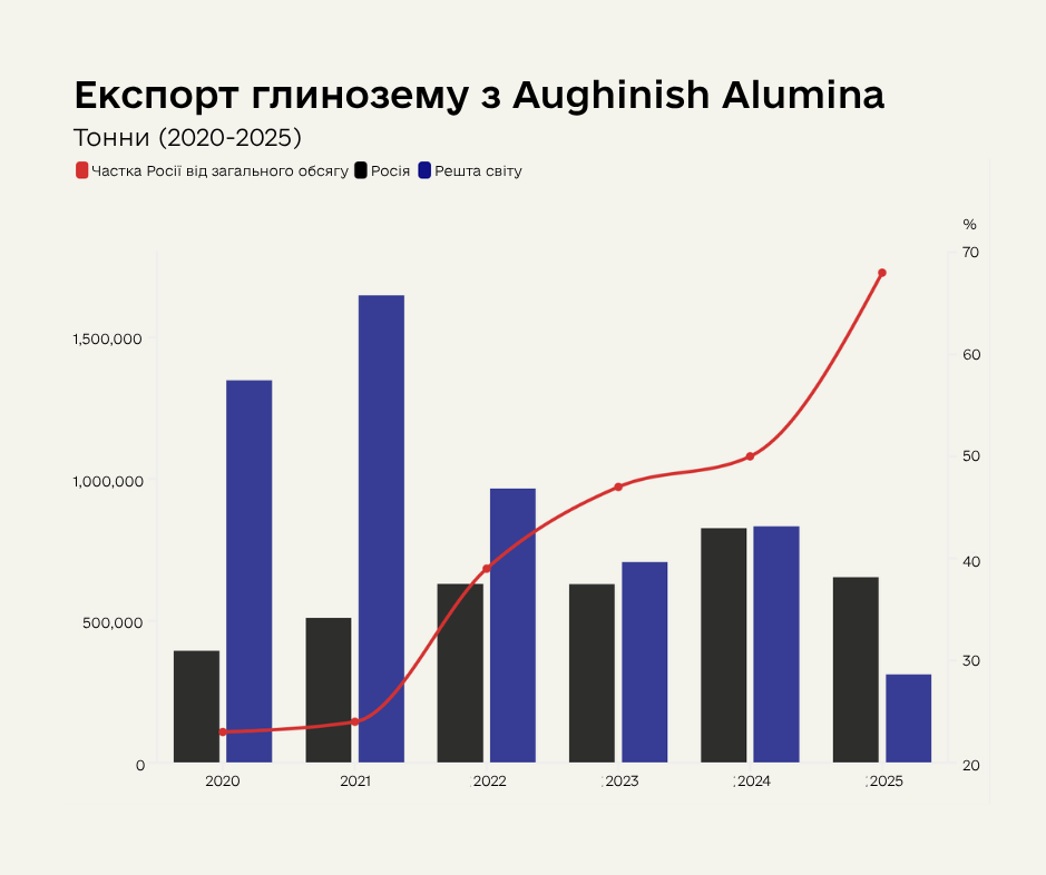 Та вже 2022 року його головним імпортером стала Росія: згідно з даними статистичного управління Ірландії, саме туди йшли 68% всієї продукції Aughinish.