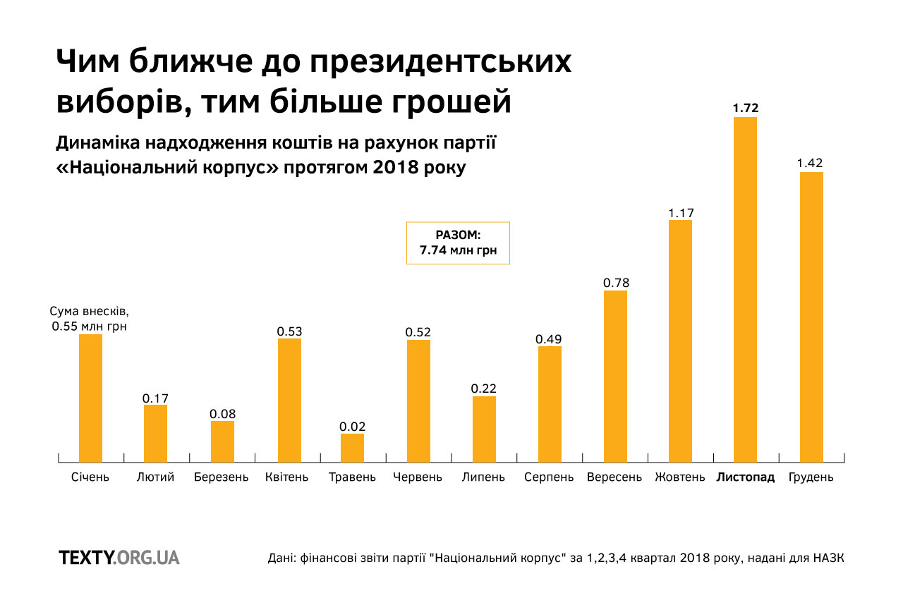Але такі маленькі пожертви (по 20—150 грн) не роблять погоди в загальному фінансовому потоці — бо таким чином партія назбирала всього 52 тисячі гривень. А всього за рік «Нацкорпус» офіційно отримав 7 мільйонів 755 тисяч гривень. І дві третини пожертв на рахунки націоналістів «капнуло» із початком активної фази передвиборчої кампанії на президентські вибори — у вересні-грудні 2018 року.